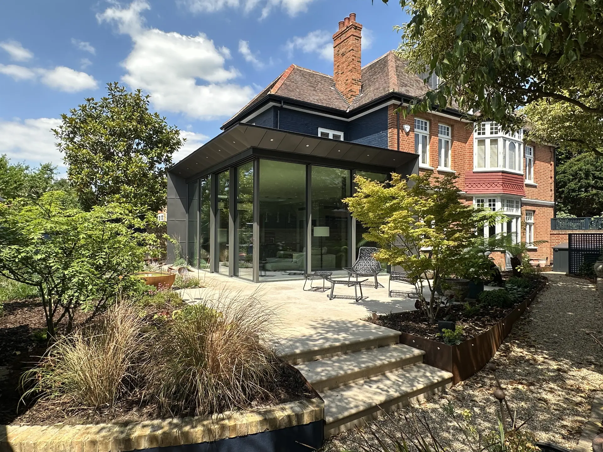- Sustainable Craftsmanship – Selected VM Zinc, Jura Beige limestone, Cor-Ten steel and eco-gravel grids, combining premium aesthetics with environmental responsibility whilst repurposing original property elements.